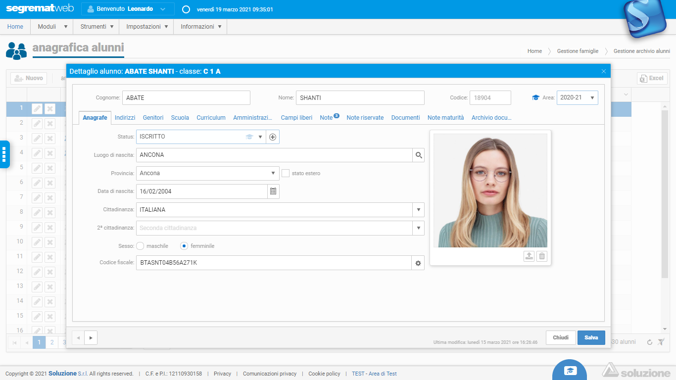 Gestisce in modo completo l’anagrafe di alunni e genitori: dati anagrafici, dati scolastici, curriculum, dati amministrativi, campi personalizzabili, archivio documenti.